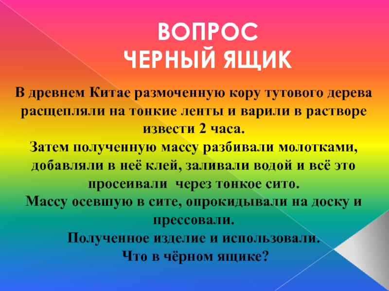 ВОПРОС  ЧЕРНЫЙ ЯЩИКВ древнем Китае размоченную кору тутового дерева расщепляли на тонкие ленты и варили в