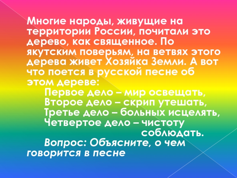 Слайд 38Многие народы, живущие на территории России, почитали это дерево, как священное.