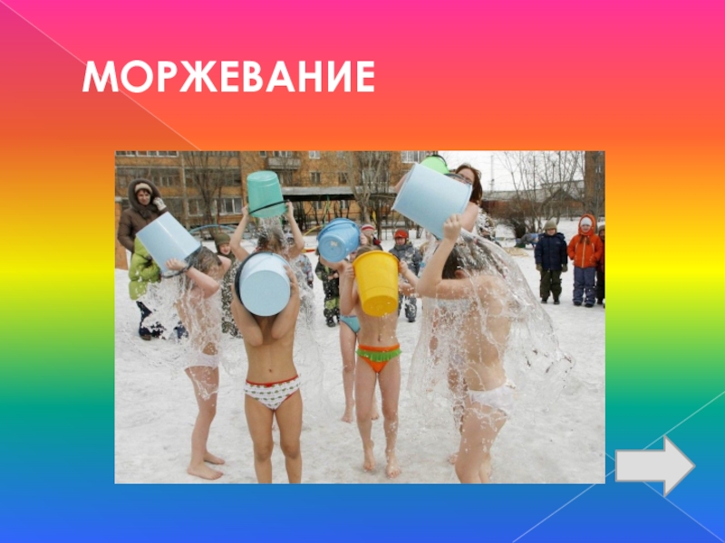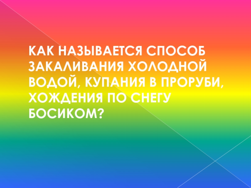 Слайд 24КАК НАЗЫВАЕТСЯ СПОСОБ ЗАКАЛИВАНИЯ ХОЛОДНОЙ ВОДОЙ, КУПАНИЯ В ПРОРУБИ, ХОЖДЕНИЯ ПО