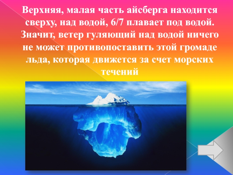 Слайд 15Верхняя, малая часть айсберга находится сверху, над водой, 6/7 плавает под