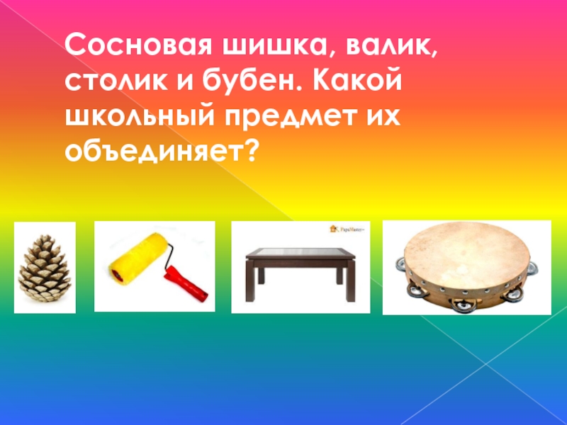 Слайд 18Сосновая шишка, валик, столик и бубен. Какой школьный предмет их объединяет?