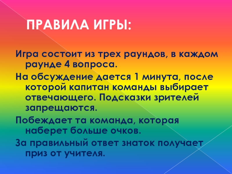ПРАВИЛА ИГРЫ:Игра состоит из трех раундов, в каждом раунде 4 вопроса.На обсуждение дается 1 минута, после которой капитан команды выбирает отвечающего. Подсказки зрителей запрещаются. Побеждает та команда, которая наберет больше очков. За правильный ответ знаток получает