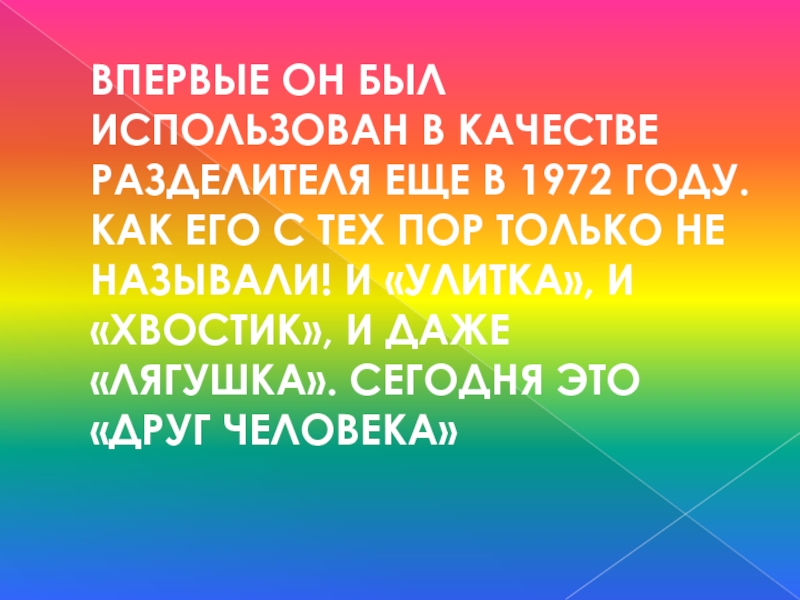 Слайд 34ВПЕРВЫЕ ОН БЫЛ ИСПОЛЬЗОВАН В КАЧЕСТВЕ РАЗДЕЛИТЕЛЯ ЕЩЕ В 1972 ГОДУ.