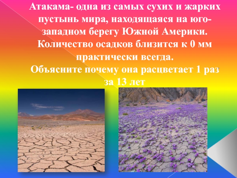 Слайд 16Атакама- одна из самых сухих и жарких пустынь мира, находящаяся на