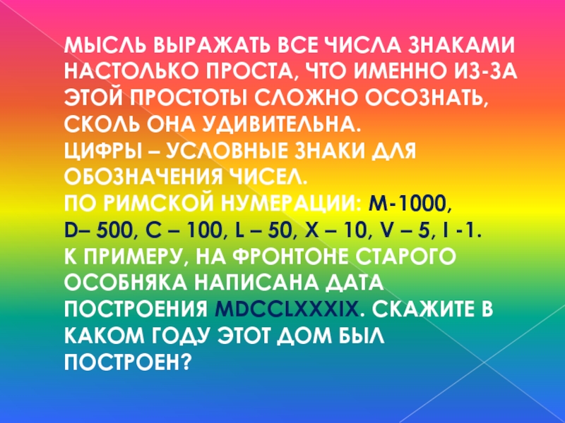 простоты сложно осознать, сколь она удивительна. Цифры – условные знаки для обозначения чисел. По римской нумерации: М-1000, D– 500, C – 100, L – 50, X – 10, V – 5, I -1. К ПРИМЕРУ, на фронтоне старого особняка НАПИСАНА ДАТА ПОСТРОЕНИЯ MDCCLXXXIX. скажите в каком году этот дом был построен?