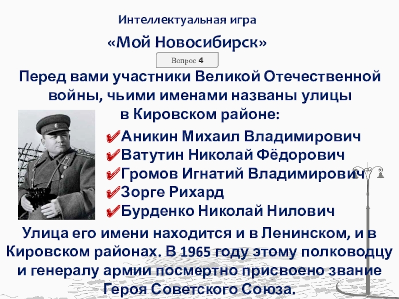 Улица его имени находится и в Ленинском, и в Кировском районах. В 1965 году этому полководцу и генералу армии посмертно присвоено звание Героя Советского Союза.