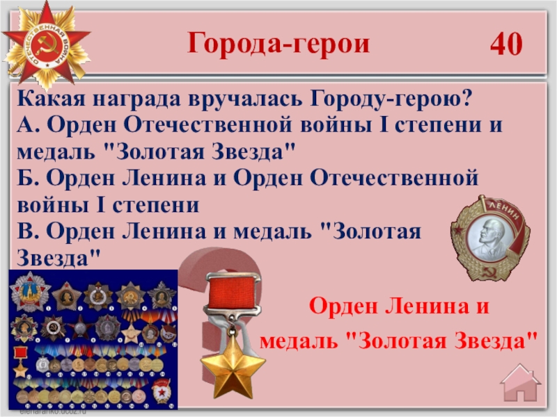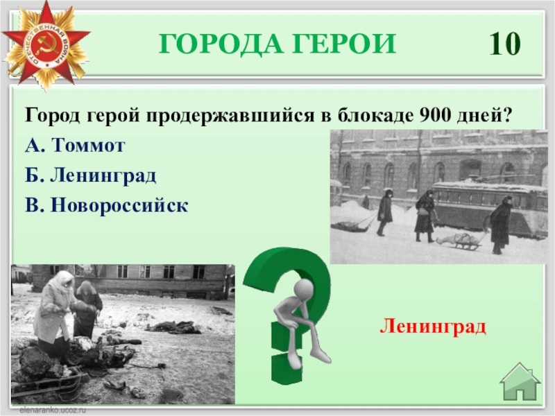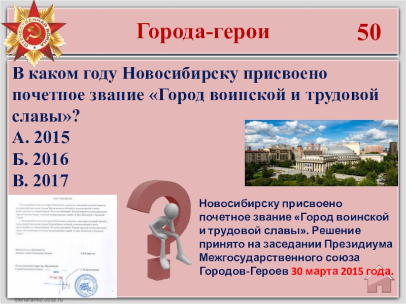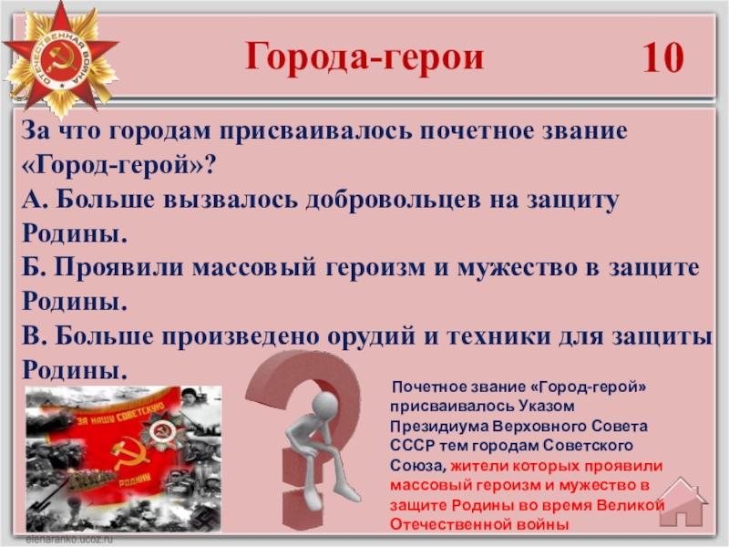 Почетное звание «Город-герой» присваивалось Указом Президиума Верховного Совета СССР тем городам Советского Союза, жители которых проявили массовый героизм и мужество в защите Родины во время Великой Отечественной войны