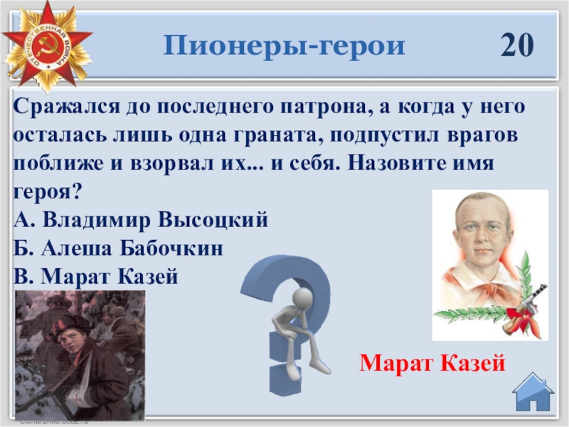 Сражался до последнего патрона, а когда у него осталась лишь одна граната, подпустил врагов поближе и взорвал их... и себя. Назовите имя героя?