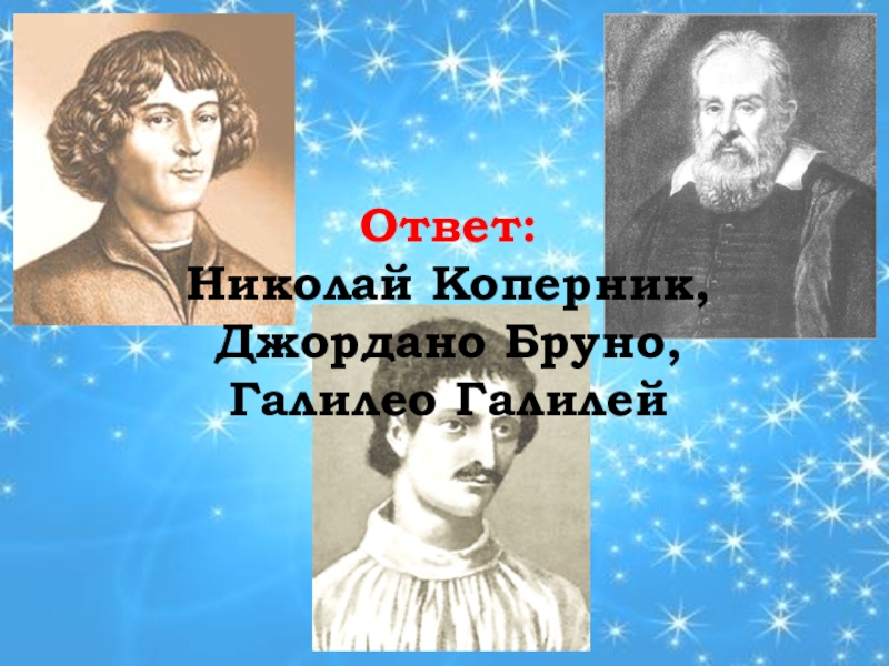 Слайд 15Ответ: Николай Коперник, Джордано Бруно, Галилео Галилей