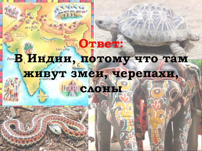 Слайд 3 Ответ: В Индии, потому что там живут змеи, черепахи, слоны