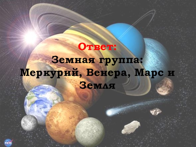 Слайд 23Ответ: Земная группа: Меркурий, Венера, Марс и Земля