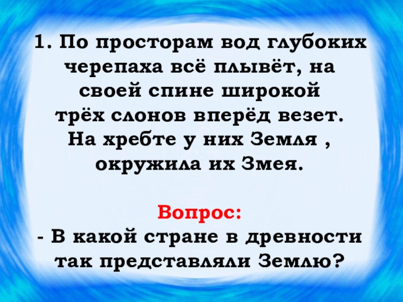 1. По просторам вод глубоких черепаха всё плывёт, на своей спине широкой трёх слонов вперёд везет. На хребте у них Земля , окружила их Змея. Вопрос: - В какой стране в древности