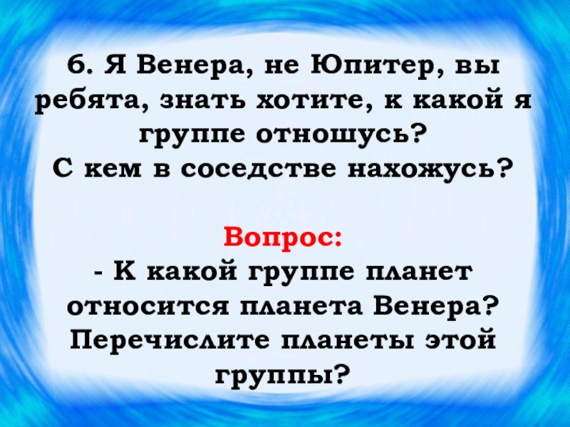 6. Я Венера, не Юпитер, вы ребята, знать хотите, к какой я группе отношусь?  С кем
