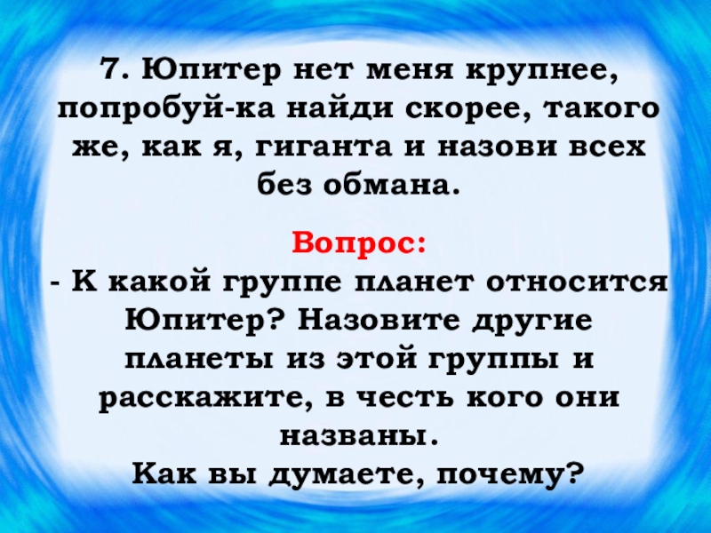 7. Юпитер нет меня крупнее, попробуй-ка найди скорее, такого же, как я, гиганта и назови всех без