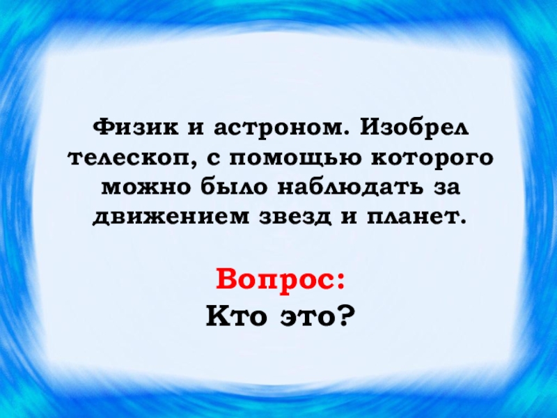 Физик и астроном. Изобрел телескоп, с помощью которого можно было наблюдать за движением звезд и планет.Вопрос:Кто это?