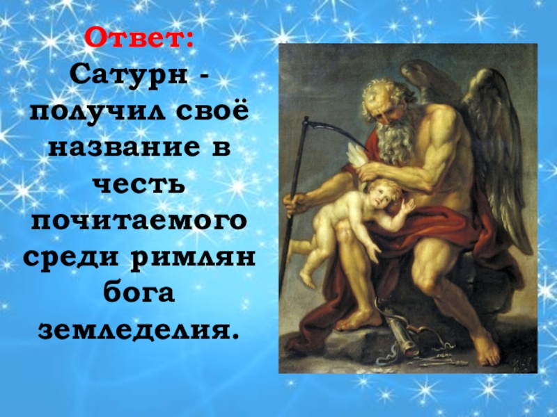 Слайд 17Ответ: Сатурн -получил своё название в честь почитаемого среди римлян бога