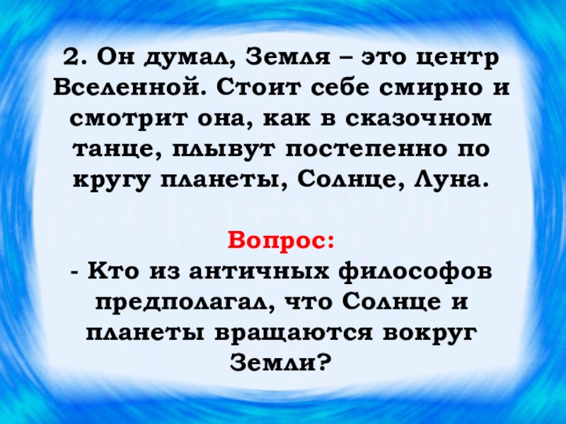 2. Он думал, Земля – это центр Вселенной. Стоит себе смирно и смотрит она, как в