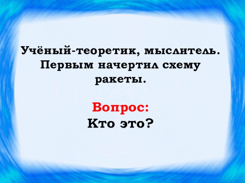 Учёный-теоретик, мыслитель.Первым начертил схему ракеты.Вопрос:Кто это?