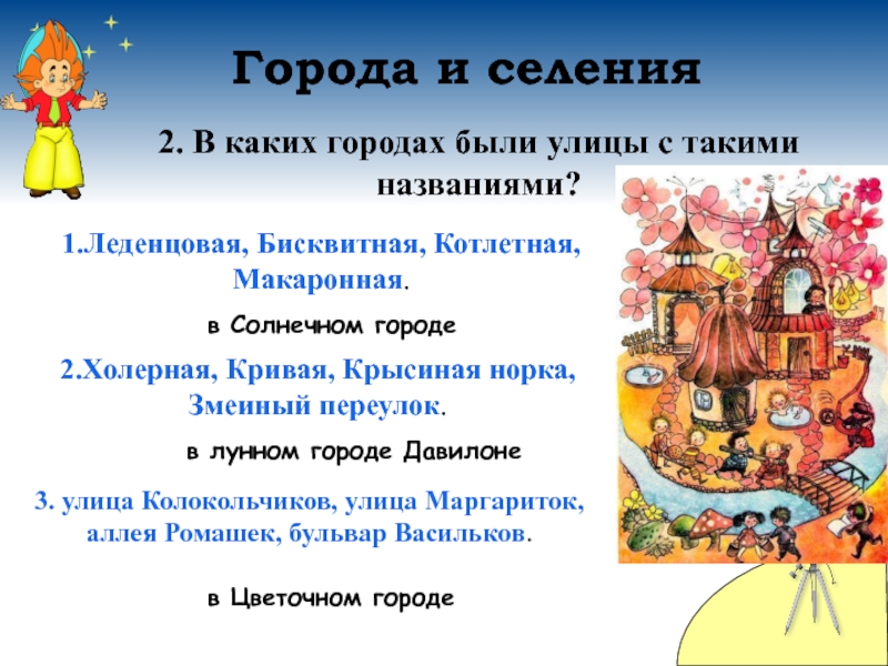 3. улица Колокольчиков, улица Маргариток, аллея Ромашек, бульвар Васильков.