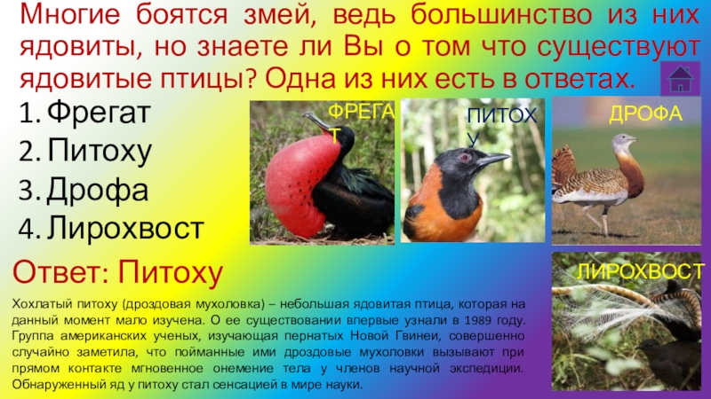 Хохлатый питоху (дроздовая мухоловка) – небольшая ядовитая птица, которая на данный момент мало изучена. О ее существовании впервые узнали в 1989 году. Группа американских ученых, изучающая пернатых Новой Гвинеи, совершенно случайно заметила, что пойманные ими дроздовые мухоловки вызывают при прямом контакте мгновенное онемение тела у членов научной экспедиции. Обнаруженный яд у питоху стал сенсацией в мире науки.