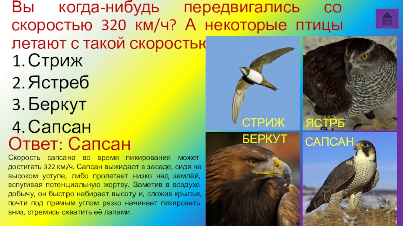 Скорость сапсана во время пикирования может достигать 322 км/ч. Сапсан выжидает в засаде, сидя на высоком уступе, либо пролетает низко над землёй, вспугивая потенциальную жертву. Заметив в воздухе добычу, он быстро набирает высоту и, сложив крылья, почти под прямым углом резко начинает пикировать вниз, стремясь схватить её лапами.