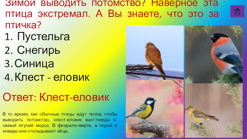 В то время, как обычные птицы ждут тепла, чтобы выводить потомство, клест-еловик вьет гнезда в самый жгучий мороз. В феврале-марте, а порой и январе они откладывают яйца.