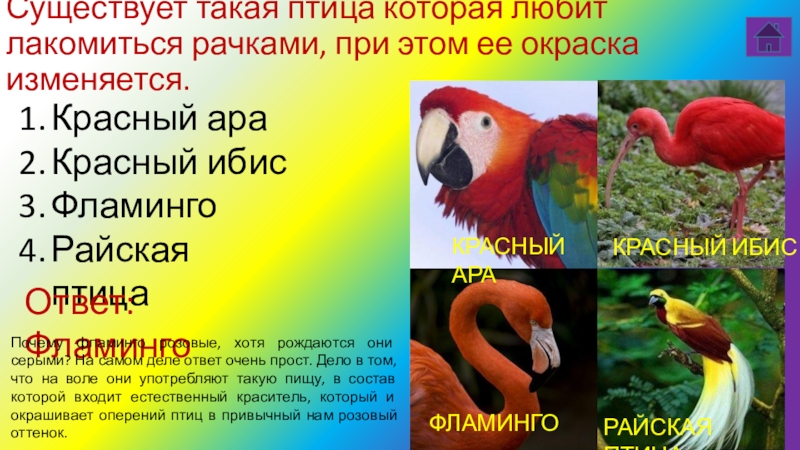 Почему фламинго розовые, хотя рождаются они серыми? На самом деле ответ очень прост. Дело в том, что на воле они употребляют такую пищу, в состав которой входит естественный краситель, который и окрашивает оперений птиц в привычный нам розовый оттенок.