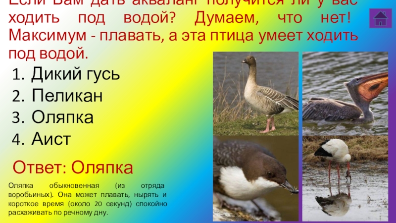 Оляпка обыкновенная (из отряда воробьиных). Она может плавать, нырять и короткое время (около 20 секунд) спокойно расхаживать по речному дну.