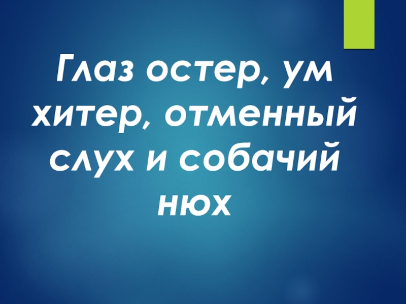 Слайд 7Глаз остер, ум хитер, отменный слух и собачий нюх