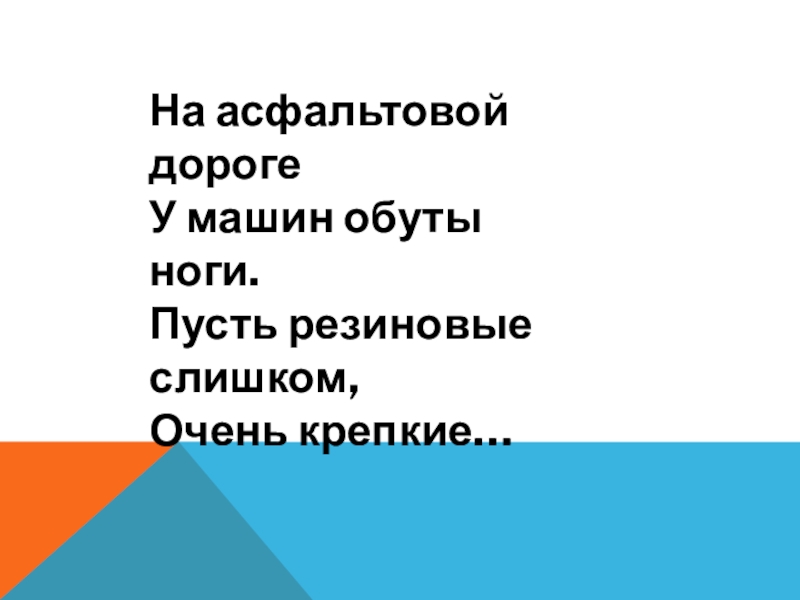 На асфальтовой дорогеУ машин обуты ноги.Пусть резиновые слишком,Очень крепкие…
