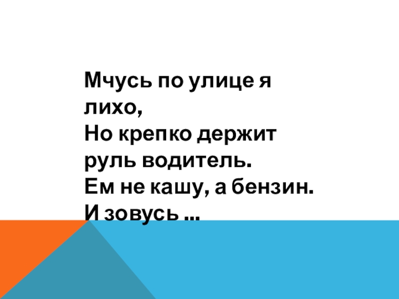 Мчусь по улице я лихо,Но крепко держит руль водитель.Ем не кашу, а бензин.И зовусь ...