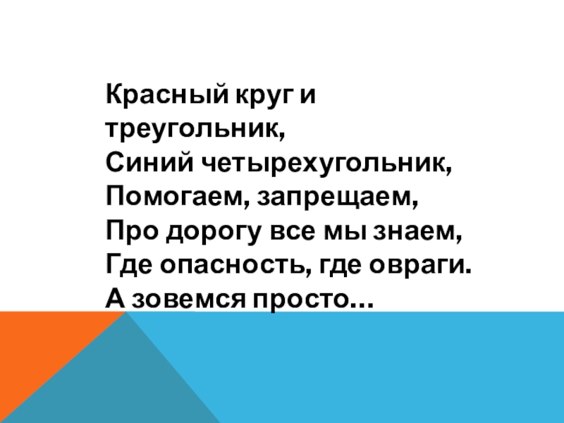 Красный круг и треугольник,Синий четырехугольник,Помогаем, запрещаем,Про дорогу все мы знаем,Где опасность, где овраги.А зовемся просто…