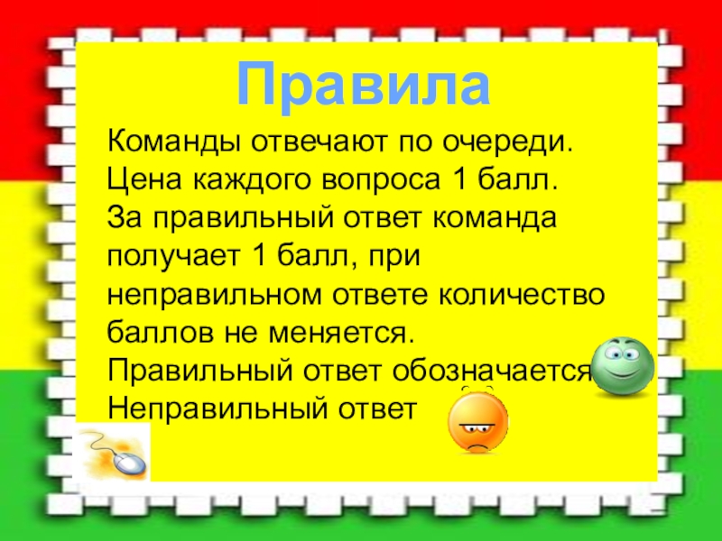 ПравилаКоманды отвечают по очереди.Цена каждого вопроса 1 балл.За правильный ответ команда получает 1 балл, при неправильном