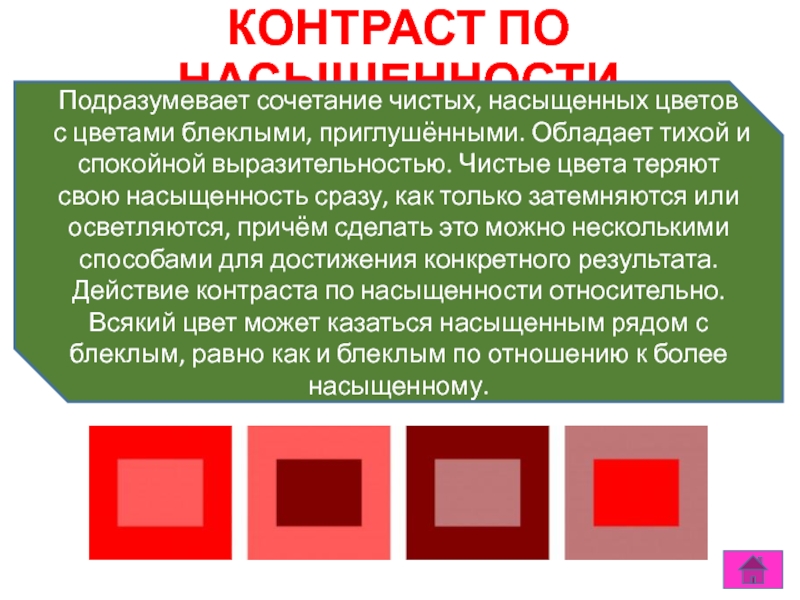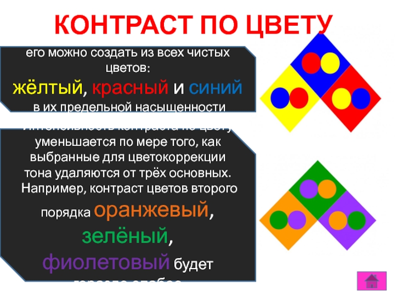 Интенсивность контраста по цвету уменьшается по мере того, как выбранные для цветокоррекции тона удаляются от трёх основных.