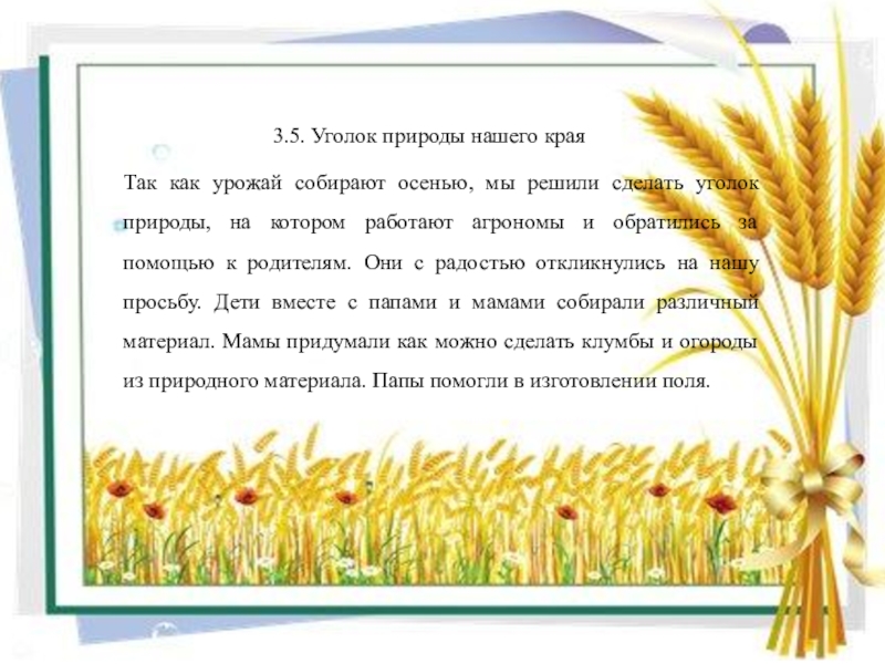 Узнали: как много труда вкладывают работники сельского хозяйства, чтобы вырастить хороший урожай, чтобы домашние животные давали больше молока, мяса, яиц. Их труд нелегок, отнимает много сил и времени. Это способствует воспитанию уважения к труду взрослых и любви к родному краю.