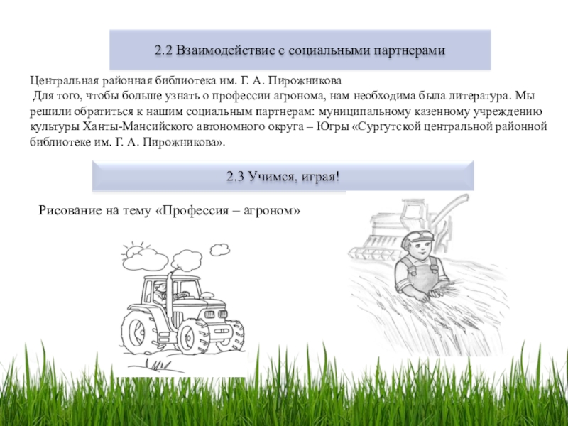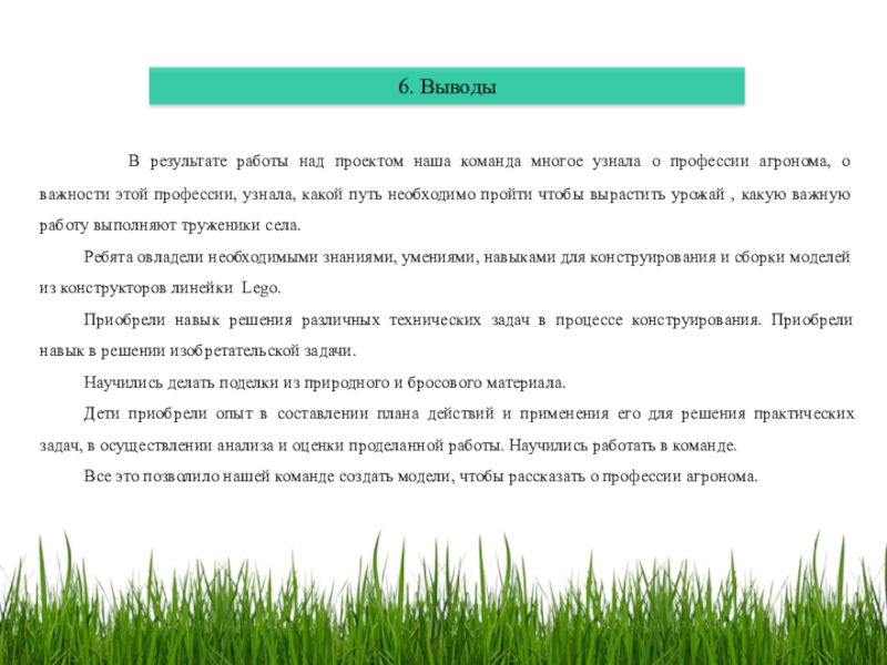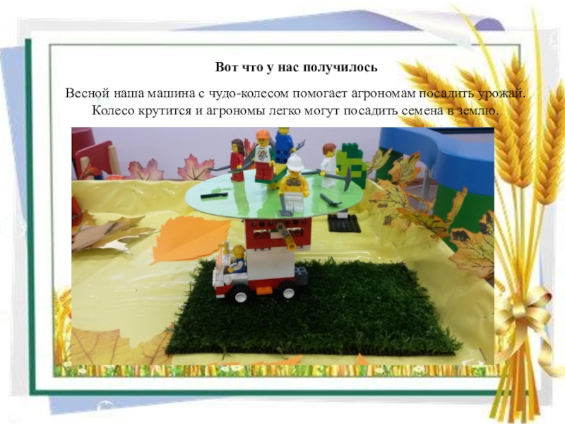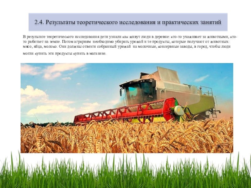 Узнали: В наши дни работникам сельского хозяйства труд облегчает техника, в которой они должен хорошо разбираться. Ведь чтобы вспахать землю для посева зерна, чтобы скосить сено на корм коровам, овцам и лошадям, нужно уметь обращаться со специальной техникой: тракторами, сенокосилками, комбайнами, поливочными машинами. Узнали о труде взрослых, занятых в сельскохозяйственном производстве (хлеборобов, животноводов, овощеводов), о приобщении детей к труду на родной земле. Поэтому без специальных профессий в сельском хозяйстве не обойтись.
