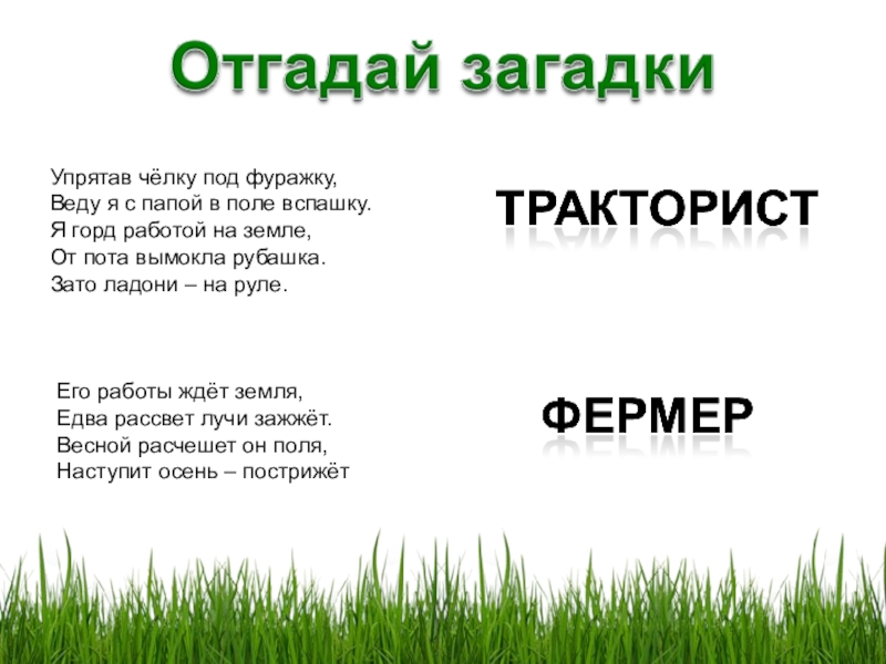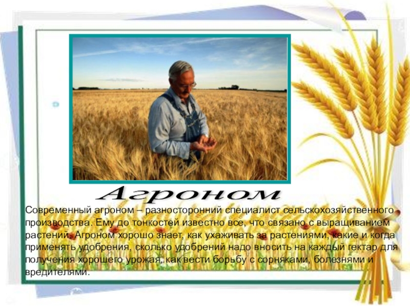Узнали: человек, который владеет землей или арендует её, и занимается на ней сельским хозяйством. Фермер-это человек, который ведет хозяйство, снабжает людей овощами и фруктами, мясом и молоком. У фермера большое хозяйство: есть коровы, козы, овцы, свиньи, лошади, есть и домашняя птица. Фермеру нелегко управляться с большим количеством животных и птиц. Все члены его семьи трудятся с раннего утра и до позднего вечера. Работают в деревне люди, которые труда не боятся. Агроном-специалист сельского хозяйства, который знает все о растениях, как и когда, высаживать, поливать, удобрять. Агроном создаёт условия для жизни растений, регулирует водный, светотепловой и питательный режимы.