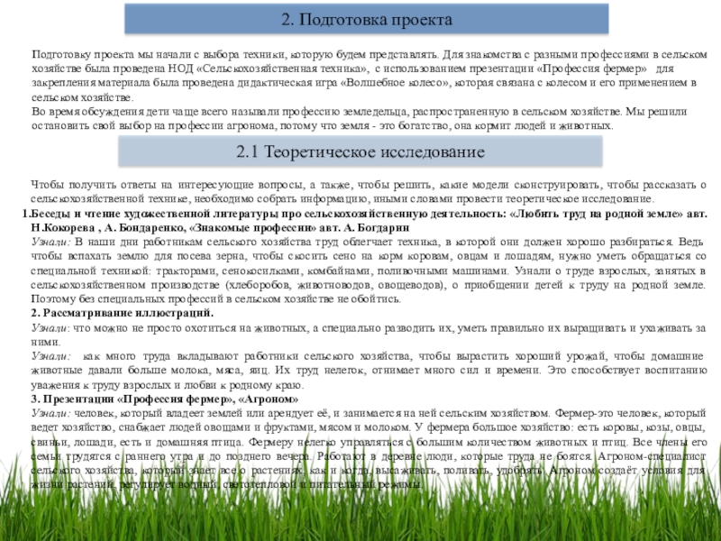 Чтобы получить ответы на интересующие вопросы, а также, чтобы решить, какие модели сконструировать, чтобы рассказать о сельскохозяйственной технике, необходимо собрать информацию, иными словами провести теоретическое исследование.