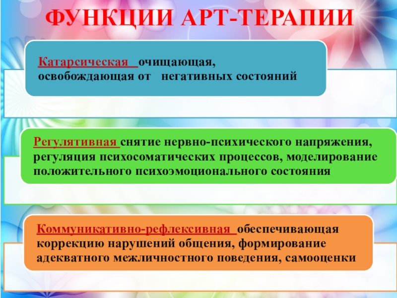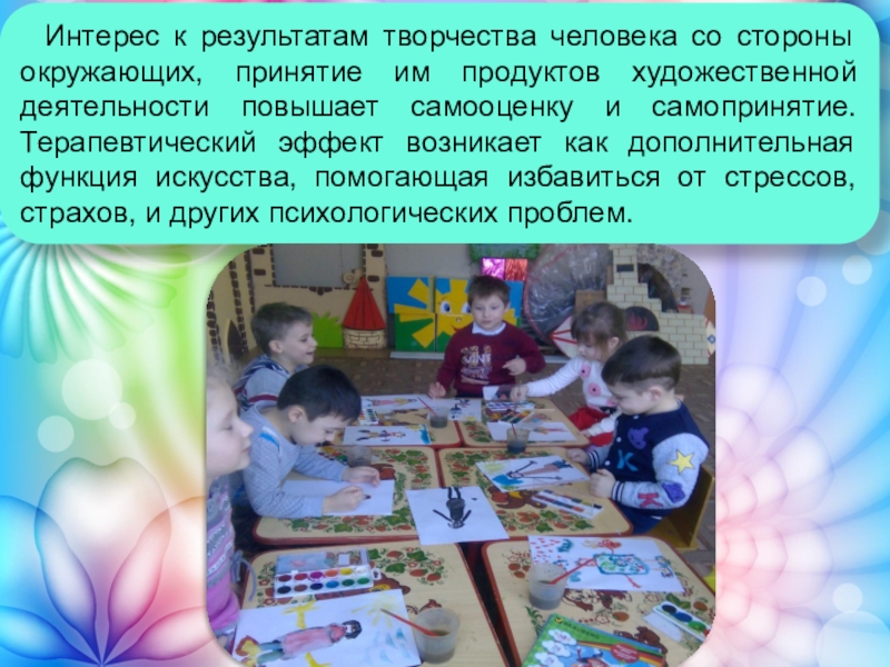 художественной деятельности повышает самооценку и самопринятие. Терапевтический эффект возникает как дополнительная функция искусства, помогающая избавиться от стрессов, страхов, и других психологических проблем.