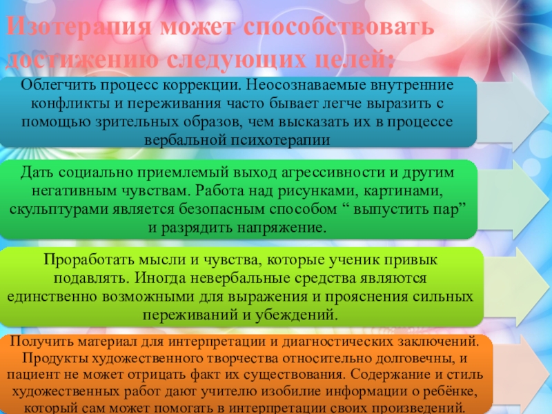 Слайд 22Изотерапия может способствовать достижению следующих целей: