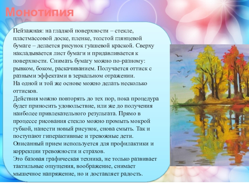 глянцевой бумаге – делается рисунок гуашевой краской. Сверху накладывается лист бумаги и придавливается к поверхности. Снимать бумагу можно по-разному: рывком, боком, раскачиванием. Получается оттиск с разными эффектами в зеркальном отражении.