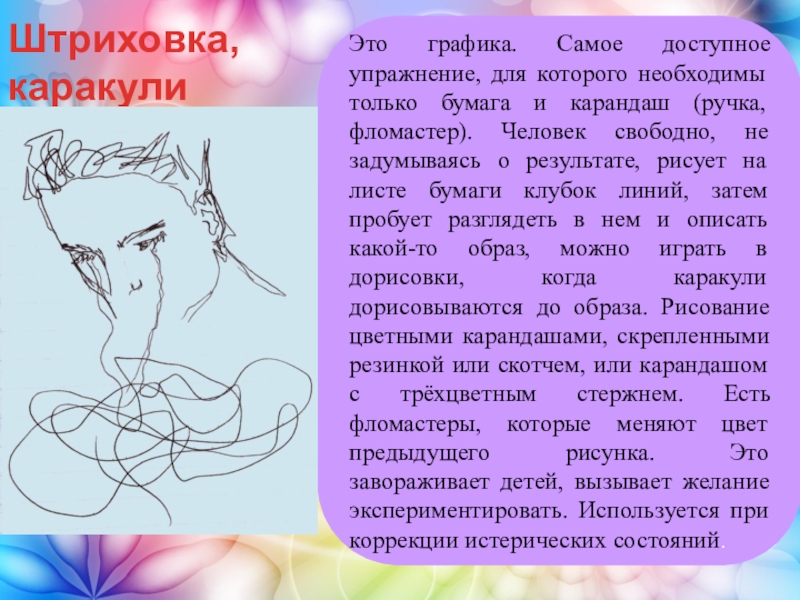 и карандаш (ручка, фломастер). Человек свободно, не задумываясь о результате, рисует на листе бумаги клубок линий, затем пробует разглядеть в нем и описать какой-то образ, можно играть в дорисовки, когда каракули дорисовываются до образа. Рисование цветными карандашами, скрепленными резинкой или скотчем, или карандашом с трёхцветным стержнем. Есть фломастеры, которые меняют цвет предыдущего рисунка. Это завораживает детей, вызывает желание экспериментировать. Используется при коррекции истерических состояний.