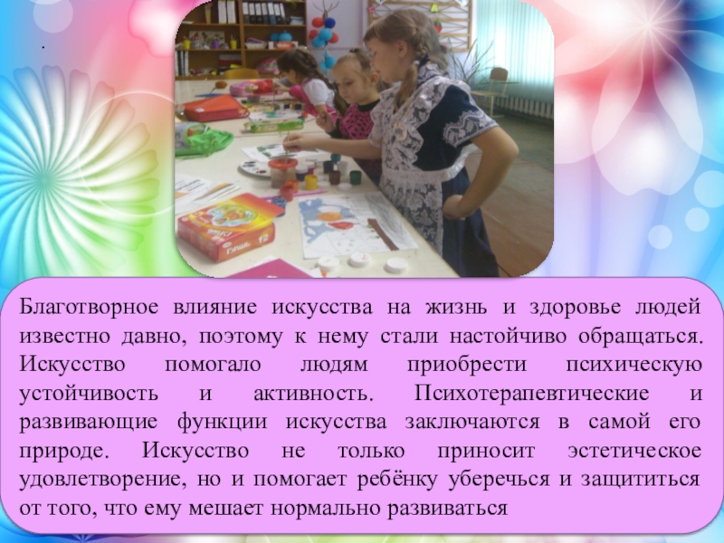 к нему стали настойчиво обращаться. Искусство помогало людям приобрести психическую устойчивость и активность. Психотерапевтические и развивающие функции искусства заключаются в самой его природе. Искусство не только приносит эстетическое удовлетворение, но и помогает ребёнку уберечься и защититься от того, что ему мешает нормально развиваться