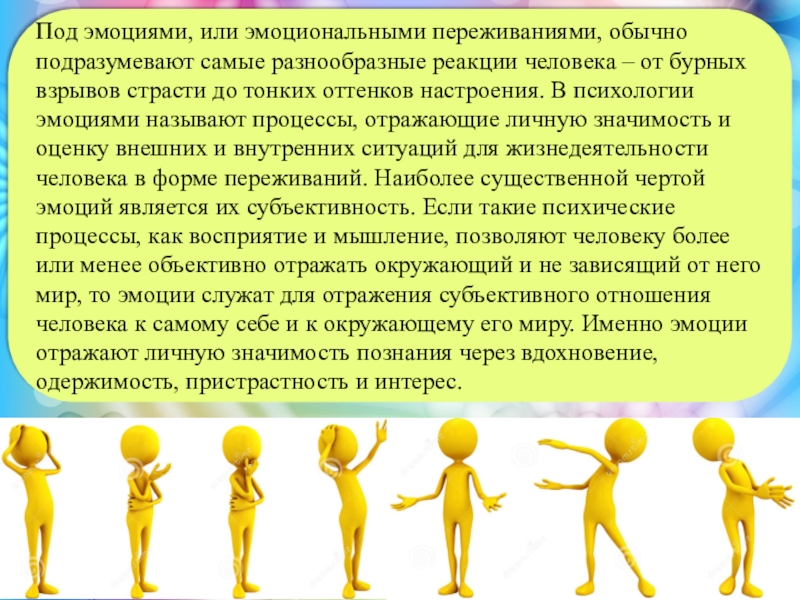 – от бурных взрывов страсти до тонких оттенков настроения. В психологии эмоциями называют процессы, отражающие личную значимость и оценку внешних и внутренних ситуаций для жизнедеятельности человека в форме переживаний. Наиболее существенной чертой эмоций является их субъективность. Если такие психические процессы, как восприятие и мышление, позволяют человеку более или менее объективно отражать окружающий и не зависящий от него мир, то эмоции служат для отражения субъективного отношения человека к самому себе и к окружающему его миру. Именно эмоции отражают личную значимость познания через вдохновение, одержимость, пристрастность и интерес.
