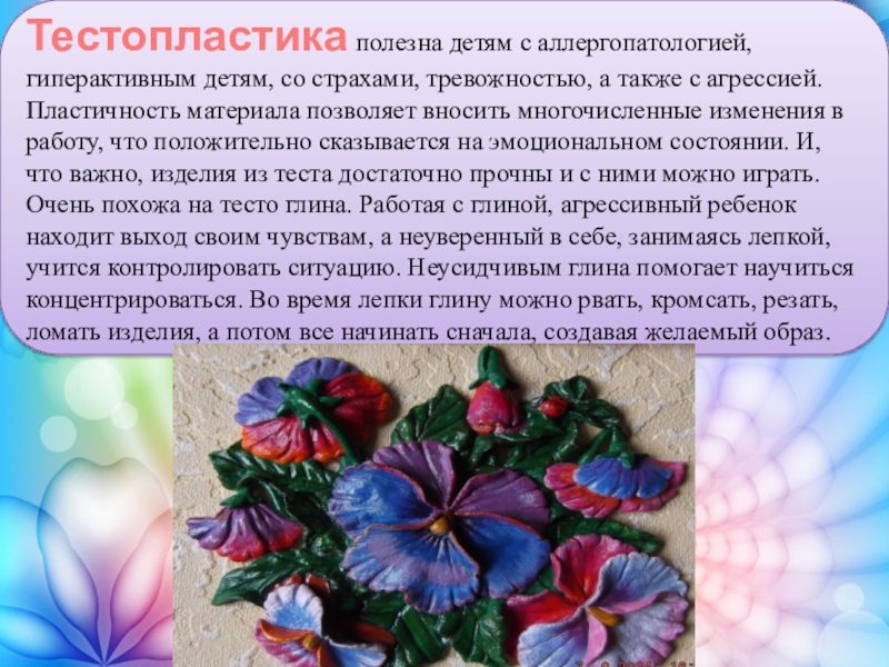 Слайд 18Тестопластика полезна детям с аллергопатологией, гиперактивным детям, со страхами, тревожностью, а