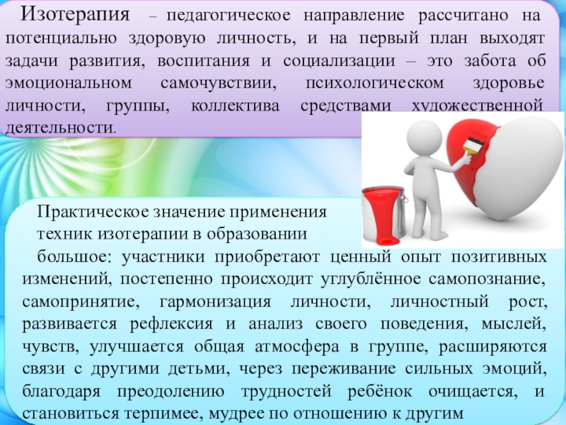 Слайд 6Изотерапия – педагогическое направление рассчитано на потенциально здоровую личность, и на