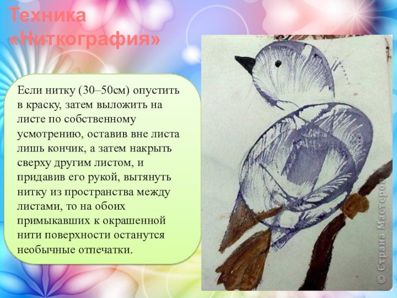 по собственному усмотрению, оставив вне листа лишь кончик, а затем накрыть сверху другим листом, и придавив его рукой, вытянуть нитку из пространства между листами, то на обоих примыкавших к окрашенной нити поверхности останутся необычные отпечатки.