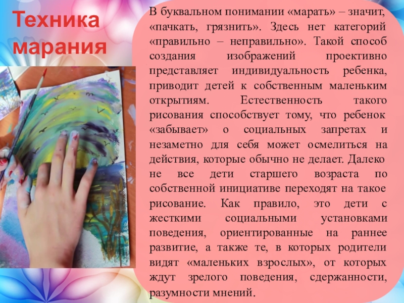 категорий «правильно – неправильно». Такой способ создания изображений проективно представляет индивидуальность ребенка, приводит детей к собственным маленьким открытиям. Естественность такого рисования способствует тому, что ребенок «забывает» о социальных запретах и незаметно для себя может осмелиться на действия, которые обычно не делает. Далеко не все дети старшего возраста по собственной инициативе переходят на такое рисование. Как правило, это дети с жесткими социальными установками поведения, ориентированные на раннее развитие, а также те, в которых родители видят «маленьких взрослых», от которых ждут зрелого поведения, сдержанности, разумности мнений.