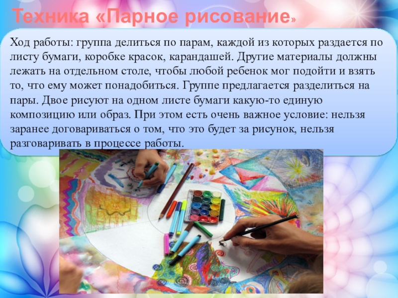 раздается по листу бумаги, коробке красок, карандашей. Другие материалы должны лежать на отдельном столе, чтобы любой ребенок мог подойти и взять то, что ему может понадобиться. Группе предлагается разделиться на пары. Двое рисуют на одном листе бумаги какую-то единую композицию или образ. При этом есть очень важное условие: нельзя заранее договариваться о том, что это будет за рисунок, нельзя разговаривать в процессе работы.
