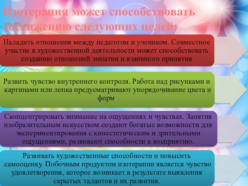 Слайд 23Изотерапия может способствовать достижению следующих целей: